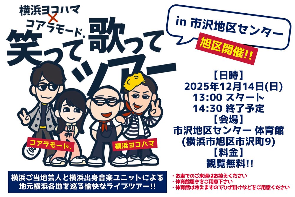 笑って歌ってツアー 市沢地区センター LIVE/EVENT 2025/12/14(日) 市沢地区センター 地図を表示 🌈今年最後の「笑って歌ってツアー」開催決定‼️今回はなんと…『旭区』へ🌅✨7年ぶりに市沢地区センターに帰ってきます🐨⚓️みんなで2025年の締めくくり、最高の笑顔で🎤🎶 URLをコピーする 報告する