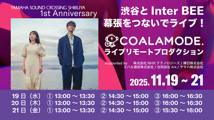 私たちは 渋谷「Yamaha Sound Crossing」 を会場にパフォーマンスを行い、その音声・映像をヤマハの音響機器と各社の通信技術を通じてリアルタイムで幕張メッセの「Inter BEE」会場へ送信します。